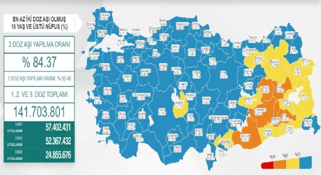 En az 2 doz aşı olmuş 18 yaş üzeri nüfusu kapsayan verilere göre Türkiye'de 2. doz aşılama ortalaması yüzde 84,37 oldu. 1. doz ortalaması yüzde 92,48 olurken, 1., 2. ve 3. doz aşısını olan vatandaş sayısı toplamda 141 milyon 703 bin 801 ’e yükseldi.