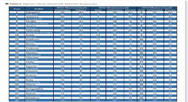 Üniversite öğrenciliğinin herkesin hayatının önemli bir dönemi olduğu anlatılan araştırma sonuçlarında, “Sadece iyi bir üniversitede okumak kişinin bu yılları ne derecede verimli geçtiğini tek başına belirlemekte yeterli olamamaktadır. Üniversite yıllarında yetişkinliğe ve profesyonel hayata atılırken nasıl bir çevre ve şehirde bulunulduğunun da değeri çok yüksektir. Türkiye’de üniversite şehirlerinin öğrencilerin beklentilerine ne düzeyde cevap verebildiği üzerine araştırmalara rastlanmamaktadır. Üniversite öğrencileri okuduğu şehirden ve halkından ne kadar memnundur? Elinizdeki çalışma bu soruya cevap aramakta ve üniversite şehirlerini öğrencilerin memnuniyet derecesine göre sıralamaktadır. Şehirden memnuniyet; ulaşım imkânları, şehirde kendini güvende hissetme, eğlence, spor, esnafla ilişkiler, öğrencilere karşı halkın tutumu, gezi, sosyal, sanatsal ve kültürel etkinlikler ve sağlık sorunlarının çözümü gibi konularda üniversite öğrencilerin okudukları şehre ilişkin memnuniyetlerini ölçmektedir. Çalışma, Türkiye Üniversite Memnuniyet Araştırmasının [TÜMA-2022] bir parçası olup, araştırmada verileri 2022 yılında 81 ildeki 126 devlet ve 73 vakıf olmak üzere 199 üniversitede öğrenim gören 47 bin 682 öğrenciden toplanmıştır. Araştırmada veriler 10’lu Likert şeklinde 10 maddeden oluşan Şehir Memnuniyet Ölçeği (=.94) ile toplanmıştır. Ölçekten alınabilecek en düşük puan 10 en yüksek ise 100’dür. Araştırmada şehirler 6 düzeyde seviyelendirilmiştir. Seviyeler (i ) A+, (ii ) A, (iii ) B, (iv ) C, (v ) D ve (vi ) FF olarak adlandırılmıştır. Türkiye’de sadece 31 şehirden öğrenciler memnuniyet hissetmektedir. Memnuniyetin düşük olduğu 44 şehir ise öğrenci memnuniyeti konusunda bir duyarlılığa sahip olma konusunda, öğrencilerden oldukça tepki görmektedir. Bununla birlikte memnuniyet ve memnuniyetsizlik arasında kalan Türkiye’nin 7 şehri öğrenci şehri olabilme potansiyeli olmasına rağmen öğrenci memnuniyetini tam olarak sağlayamamaktadır. Türkiye’nin üniversite öğrenci başkentleri Eskişehir, Ankara ve Antalya’dır." diye anlatıldı.