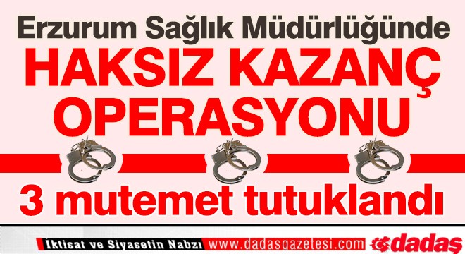 Erzurum İl Sağlık Müdürlüğünde kendilerini göreve gitmiş gibi göstererek 6 yıl boyunca harcırah alıp yaklaşık 4 milyon lira haksız kazanç sağladıkları iddia edilen 3 mutemet tutuklandı.