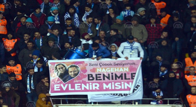 Erzurum'da, Büyükşehir Belediye Erzurumspor-Galatasaray maçının yapıldığı statta mavi beyazlı taraftar Rıfat Kırkkeseli, kız arkadaşına taraftarların da desteğiyle sürpriz evlilik teklifi yaptı.