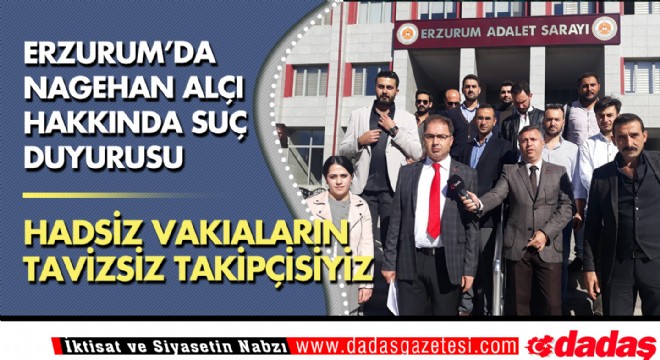 Katıldığı bir televizyon programında 'Katil devlet' çıkışıyla skandala imza atan Nagehan Alçı'ya tepkiler artarak devam ediyor. Türk Hukuk Enstitüsü Erzurum Şube Başkanı Av. Ufuk Dikbaş ve ekibi, gazeteci Nagehan Alçı hakkında Erzurum Cumhuriyet Başsavcılığına suç duyurusunda bulundu, Erzurum adliyesi önünde basın açıklamasında bulundu.