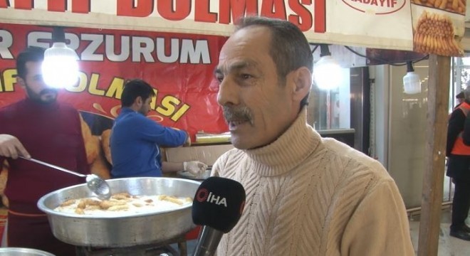 Dolma kadayıf ustası Sönmez Aslan ise dolma kadayıfıyla Erzurum’un tanıtılmasına katkıda bulunduklarını belirterek, “Burada Erzurum’un Meşhur kadayıf dolmasını yapıyorum. Erzurum’u tanıtmak için geldik. Kadayıf dolmamız ad üstünde kadayıftan yapılıyor. Kadayıf dolması görüldüğü üzere önce sarılarak şekli verilir. Sonra da yumurtaya bulanıp kızgın yağda kızartılır. İyice kızardıktan sonra da şerbete bulanıp servise hazır olur” ifadelerini kullandı.