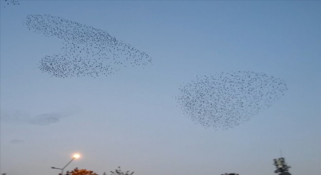 Erzurum'da gün batımında bir araya gelen yüzlerce sığırcık kuşu, topluca yaptıkları hareketlerle izleyenlere görsel şölen sundu