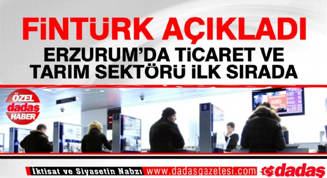 Finansal Türkiye Haritası(FİNTÜRK) 2018 yılı 6’ıncı dönem verileri bazında Erzurum sektörel kredi performansı yüksekliği bakımından Bölge illeri içinde Malatya ve Elazığ illeriyle birlikte ön sırada yer aldı. İl bölge illeri içinde Ticaret ve tarım sektörü kredileri bakımından 1, gıda ve inşaat sektörü kredisi kullanımında 2, turizm sektörü kredilerinde ise 3’üncü sırayı aldı.