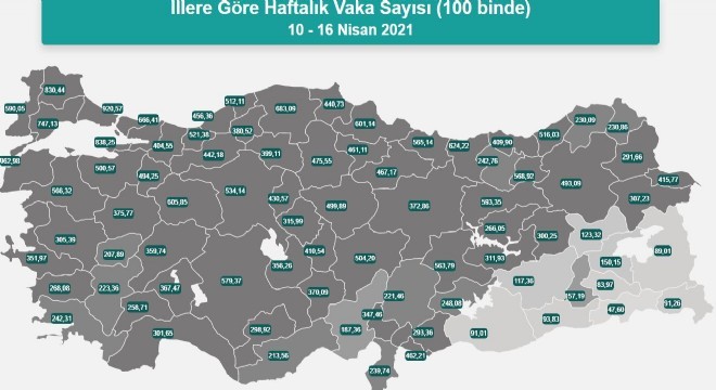 Sağlık Bakanlığı verilerine göre her yüz bin kişide tespit edilen vaka sayısı; Çanakkale 962,98, İstanbul 920,57, Yalova 838,25, Kırklareli 830,44, Tekirdağ 747,13, Kastamonu 683,09, Kocaeli   666,41, Giresun 624,22, Eskişehir 605,85, Samsun 601,14, Erzincan 593,35, Edirne 590,05, Konya 579,37, Bayburt 568,92, Balıkesir 566,32, Ordu 565,14, Malatya 563,79, Ankara 534,14, Düzce 521,38, Rize 516,03, Bartın 512,11, Kayseri 504,2, Bursa 500,57, Yozgat 499,89, Bilecik 494,25, Erzurum 493,09, Çorum 475,55, Tokat 467,17, Kilis 462,21, Amasya 461,11, Zonguldak 456,36, Bolu 442,18, Sinop 440,73, Kırıkkale 430,57, Iğdır 415,77, Nevşehir 410,54, Trabzon 409,9, Sakarya 404,55, Çankırı 399,11, Karabük 380,52, Kütahya 375,77, Sivas 372,86, Niğde 370,09, Isparta 367,47, Afyon 359,74, Aksaray 356,26, İzmir 351,97, Osmaniye 347,46, Kırşehir 315,99, Elazığ 311,93, Ağrı 307,23, Manisa 305,39, Antalya 301,65, Bingöl 300,25, Karaman 298,92, Gaziantep 293,36, Kars 291,66, Aydın 268,08, Tunceli 266,05, Burdur 258,71, Adıyaman 248,08, Gümüşhane 242,76, Muğla 242,31, Hatay 239,74, Ardahan 230,86, Artvin 230,09, Denizli 223,36, Kahramanmaraş 221,46, Mersin 213,56, Uşak 207,89, Adana 187,36, Batman 157,19, Bitlis 150,15, Muş 123,32, Diyarbakır 117,36, Mardin 93,83, Hakkari 91,26, Şanlıurfa  91,01, Van 89,01, Siirt 83,97, Şırnak 47,6 olarak kaydedildi.