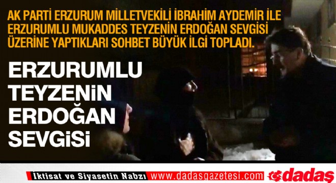 Cumhurbaşkanı Recep Tayyip Erdoğan’a yöneltilen sevgi gösterilerine bir yenisi daha eklendi. Hemen her gün, her yaştan insanın ilgi ve sevgisine mazhar olan Erdoğan için bu kez de Erzurumlu Mukaddes Koçer sevgi gösterisinde bulundu. Tüm içtenliğiyle Erdoğan’a hayranlığını ve sevgisini dile getiren Erzurumlu Mukaddes Koçer isimli teyze, “Allah onu başımızdan eksik etmesin” dedi.