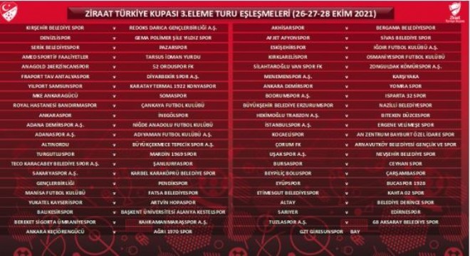 Kupada Üçüncü Eleme Turu müsabakaları tek maç eleme usulüne göre 26, 27 ve 28 Ekim tarihlerinde oynanacak.