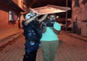 Çevik kuvvetin mahalleye girmesine izin vermeyen mahalle sakinleri evlerinden polise taş, tava tencere fırlattı. Kavgadan görüntü almak isteyen basın mensupları da atılan taşlardan nasibini aldı. Sokaktan geçmekte zorlanan İHA muhabiri Mehmet Yılmaz, polis memurunun kalkanı altında görüntü çekmeye çalıştı. Bir süre kalkan altından görüntü çeken Yılmaz, atılan taşlardan polis kalkanı sayesinde korundu.