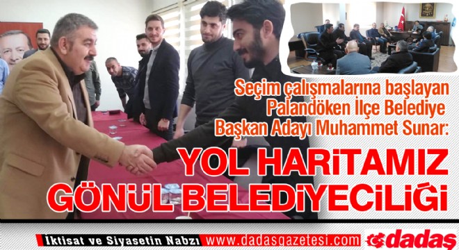 Cumhurbaşkanı Recep Tayyip Erdoğan'ın 31 Mart 2019'da yapılacak Mahalli İdareler Seçiminde Palandöken İlçe Belediye Başkan Adayı olarak açıkladığı Muhammet Sunar, ilk olarak partisinin il, İlçe, Gençlik ve Kadın Kolları yönetimiyle bir araya geldi. Akabinde Sivil Toplum Kuruluşlarını ziyaret eden Sunar, yaptığı görüşmelerde Sivil Toplum Kuruluşlarıyla sürekli irtibat halinde olacaklarının altını çizdi. İlçenin her köşesine hizmet götürme gayretinde olduklarını belirten Sunar, “Liderimiz, Cumhurbaşkanımız Sayın Recep Tayyip Erdoğan’ın Gönül Belediyeciliği projesi, yol haritamız… Gönül Belediyeciliği; Vatandaşla iç içe olmak. Gönül Belediyeciliği; sabahın seherinde esnafla birlikte kahvaltı yapmak, istişare etmek. Gönül Belediyeciliği; Haftanın en az bir günü halk günü yapmak suretiyle, vatandaşın başkana ulaşabilirliğini sağlayarak, sorunları, önerileri ve talepleri alarak gereğini yapmak. İlçemizde Kimin ne ihtiyacı varsa bilinecek.” dedi