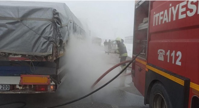 Edinilen bilgilere göre, Sivas istikametinden Erzurum istikametine giden membran yüklü tırın, Erzincan-Erzurum kara yolunda balatalarının aşırı ısınması sebebiyle lastikleri bir anda alev aldı. Seyir halinde ilerleyen tır şoförü ile irtibata geçen emniyet ve itfaiye ekipleri müdahaleye hazır oldukları noktada tırı durdurup yanan lastikleri söndürdü. Erzincan otogarına yakın bir noktada müdahale edilen tırda maddi hasar meydana gelirken başka bir olumsuzluk yaşanmadı.