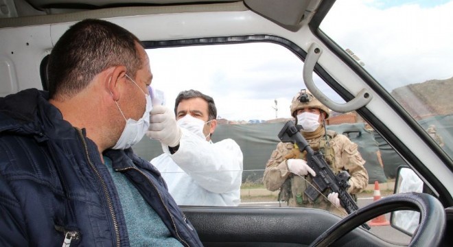 Oltu İlçe Jandarma ekipleri ilçe girişlerinde giriş yapan araçları tek tek kontrol edip ateşleri ölçülüyor.
