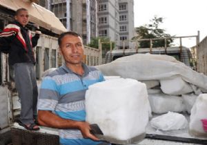 Ejder Çelik ve Saim Erim isimli iki vatandaş Muş merkeze 18 kilometre uzaklıktaki 2 bin 500 rakımlı Kurtik Dağı'nda kayalıkların arasından çıkarılan kar kalıplarını merkeze getirip satıyor.
