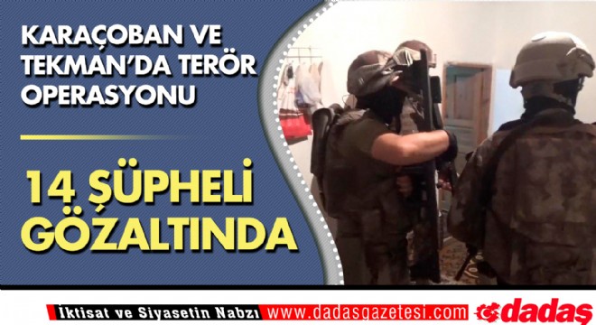 Gece yarısı Karaçoban, Tekman ve İstanbul’da farklı adreslere yönelik düzenlenen eş zamanlı operasyonlarda Karaçoban’da 8, Tekman’da 4, İstanbul’da da 2 şüpheli olmak üzere 14 şahıs gözaltına alındı.