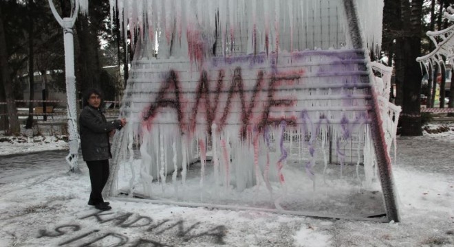 Buz tutturduğu enstalasyonun dört ayrı yüzeyine kadına ait bazı kavramları boya ile yazdığı performansı ile tamamlanan eser, şehrin merkezinde olması itibariyle kadına şiddetin acı ve insafsız yönlerini insanlara hatırlatmayı amaçladıklarını ifade eden Güzel Sanatlar Fakültesi Dekanı Prof. Dr. Mehmet Kavukcu, “Bu kurduğumuz konstrüksiyonun bir yüzeyine “Anne” yazarak, bütün anne olan kadınların sürekli aile yaşantılarında ve toplumsal hayatında yaşadıkları acılara gönderme yaptım.” dedi.