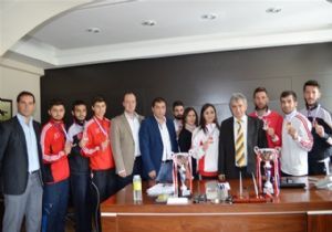 Birçok müsabakada şampiyonluklar kazanan ve Üniversiteler Karate Türkiye Şampiyonası’nda da Atatürk Üniversitesi adına kürsüye çıkmayı başaran karateciler BESYO Müdürü Prof. Dr. Mustafa Atasever’i ziyaret etti. Türkiye Üniversite Sporları Federasyonu tarafından düzenlenen ve Malatya’da yapılan Üniversitelerarası Türkiye Karate Şampiyonası’nda Antrenör Bahadır Sayıncı yönetiminde tatamiye çıkan Atatürk Üniversitesi Karatecileri başarılı sonuçlara imza atmıştı. Antrenör Bahadır Sayıncı yönetimindeki karatecilerden Rahmetullah Enes Kaya 60 kiloda Türkiye şampiyonu olurken, Ahmet Burak Akbulut 67 kiloda Türkiye ikinciliğini, 55 kiloda Ayşenur Gürbüz Türkiye üçüncülüğünü elde etmişti. Serdar Bingöl, Serhat Bingöl ve Rahmetullah Enes Kaya’dan oluşan Atatürk Üniversitesi Kata takımı Erzurum adına üçüncülük kupasını Erzurum’a getirirken, Serdar Bingöl, M.Sadık Akbulut, A. Burak Akbulut, Serhat Bingöl, Mustafa Çetin, Yasin Üstüner ve Rahmetullah Enes Kaya’nın oluşturduğu Kumite takımı da üçüncü olma başarısı göstermişti.Başarılı karateciler Türkiye Karate Federasyonu Teknik Kurul Üyesi ve Karate Bölge Başkanı Ahmet Çelebi ile Antrenör Bahadır Sayıncı yönetiminde dün Atatürk Üniversitesi Beden Eğitimi ve Spor Yüksek Okulu(BESYO) Müdürü Prof. Dr. Mustafa Atasever’i makamında ziyaret etti. Ziyarette Müdür Yardımcıları Yrd. Doç. Dr. Fatih Kıyıcı ile Yrd. Doç. Dr. Nurcan Demirel de hazır bulundu.