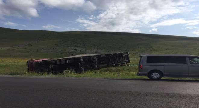 Ardahan’ın Posof ilçesinde sürücüsünün kontrolünden çıkan tır devrildi.
