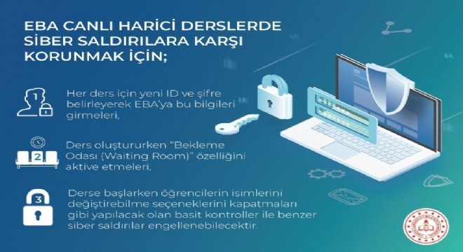 “Her ders için yeni ID ve şifre belirleyerek EBA’ya bu bilgileri girmeleri. Ders oluştururken 'Bekleme Odası (Waiting Room)' özelliğini aktive etmeleri. Derse başlarken öğrencilerin isimlerini değiştirebilme seçeneklerini kapatmaları gibi basit kontrollerle benzer siber saldırılar engellenebilecektir. Öğretmenlerimizin her ders için farklı ID ve şifre kullanmaları, daha önce çeşitli iletişim kanallarından paylaşılmış olan canlı ders bilgilerini geçersiz kılacaktır. Öğretmenlerimiz, dersleri oluştururken ‘bekleme odası’ özelliğini aktive ederek derse katılacak olan öğrencileri kontrol edip böylece sahte kimlikle derse girmeye çalışan şahısların ders ortamına katılmalarını engelleyebileceklerdir. Ayrıca öğretmenlerimizin, ders başlarken öğrencilerin isim değiştirmelerine olanak sağlayan özelliği devre dışı bırakmaları, böylelikle gerçek kimlikleriyle derse giren öğrencilerin sonradan bu bilgileri değiştirmelerine engel olacaktır. Bu hatırlatmalar, tüm öğretmenlerimizin cep telefonlarına kısa mesaj yoluyla da iletilmiştir.”