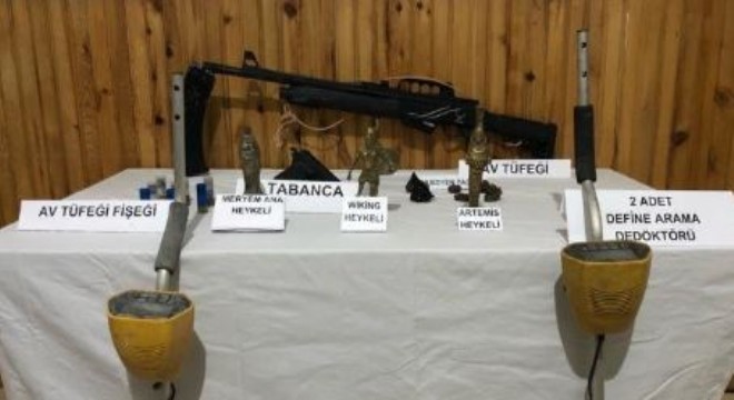 Şüpheli şahsın evinde yapılan aramada ayrıca, 1 adet Artemis heykeli, 1 adet Viking heykeli, 6 adet Osidyen taşı, 2 adet define arama dedektörü, 1 adet ruhsatsız 7.65 mm, çapında tabanca ve tabancaya ait 3 adet fişek ile 1 ruhsatsız av tüfeği ve 8 adet av tüfeği fişeği ele geçirildi.