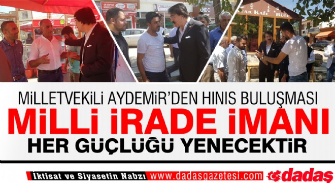 25, 26 ve 27’inci dönemdeki tüm seçimlerde ve referandumlarda Hınıs’ta oy kullanarak, ilçede hakim olan birlik ve beraberlik kararlılığını paylaştığını, Hınıslı dadaşlarla gönüllerini buluşturduğunu belirten Milletvekili Aydemir, ilçe ve halkının milli irade imanını vurgulayan bir safı tarif ettiğini ve bu safların araya hainlerin girilemeyeceği üslup ve haysiyetle sık tutulduğunu kaydetti.
