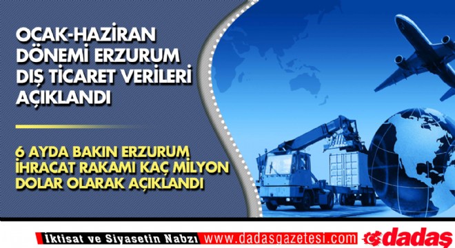 Ticaret Bakanlığı 2019 Ocak – Haziran Dönemi Erzurum dış ticaret verilerini açıkladı. Erzurum’da yılın ilk 6 ayında 9,6 milyon dolarlık ihracat, 14.1 milyon dolarlık ithalat olarak toplam 23,7 milyon dolarlık dış ticaret gerçekleştirildiği bildirildi. Bu yılın ilk 6 ayında ilden gerçekleştirilen dış ticaret 2018 yılının aynı dönemine göre yüzde 1.70 oranında geriledi.
