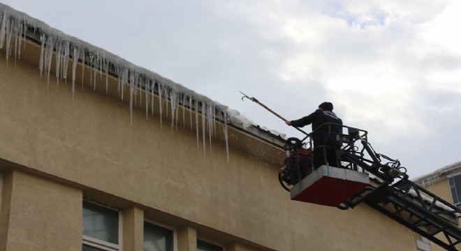 Erzurum’un Oltu ilçesinde çatılardan uzanan buz sarkıtları itfaiye ekiplerince temizlendi.