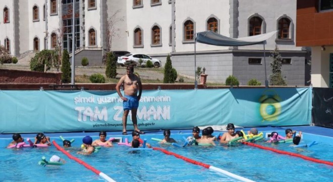 Oltu ilçesinde Gençlik Merkezi bahçesine yapılan portatif havuzda 6-14 yaş arası çocuklar yüzme dersi veriliyor.