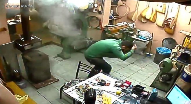 Erzurum’da bağlama ustası hazırladığı polyesteri sıcak sobanın içerisine dökünce, soba bir anda bomba gibi patladı. Patlama anı güvenlik kamerasına saniye saniye yansıdı.
