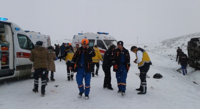 Erzurum’un Çat ilçesinde karlı yolda kayan özel halk otobüsü yan yattı. Kazada 2’i polis 18 kişi yaralanırken kaza mahalinde adeta can pazarı yaşandı.