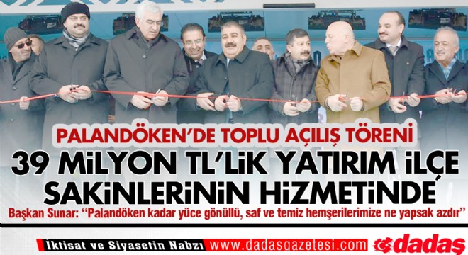 Hayata geçirdiği hizmet ve yatırımlarla adından söz ettiren Palandöken Belediyesi, Büyükşehir ile yaptığı işbirliği neticesinde, 39 Milyon TL’lik yatırımı, ilçe sakinlerinin hizmetine sundu. Yunusemre Mahallesi Abdulgafur Has Millet Bahçesiyle birlikte hizmete alınan yatırımlar için Palandöken ilçesine bağlı Yunus Emre Mahallesinde toplu açılış töreni düzenlendi. Törene; Vali Vekili, Palandöken Kaymakamı Önder Coşğun, Büyükşehir Belediye Başkanı Mehmet Sekmen, Ak Parti İl Başkanı Mehmet Emin Öz, Palandöken Belediye Başkanı Muhammet Sunar, Aziziye Belediye Başkanı Muhammed Cevdet Orhan, Atatürk Üniversitesi Rektörü Prof. Dr. Ömer Çomaklı, Erzurum Bölge İdari Mahkemesi Cumhuriyet Başsavcısı Ünal Bingül katılırken, vatandaşların da ilgisi yoğun oldu.