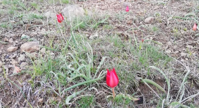 Palandöken ilçesine bağlı Yıldızkent semtinde arazide çiçek açan kırmızı laleler adeta muhteşem bir doğa tablosu görüntüsü oluşturdu.