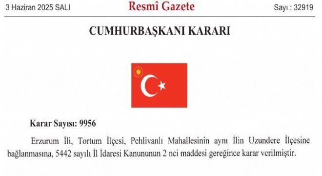 Cumhurbaşkanlığı kararı ile Tortum Pehlivanlı Uzundere ilçesine bağlandı. Resmi Gazetede yayımlanan Cumhurbaşkanlığı kararında, ‘Erzurum İli Tortum ilçesi Pehlivanlı Mahallesinin aynı ilin Uzundere İlçesine bağlanmasına 5442 sayılı İl İdaresi Kanununun 2. Maddesi gereğince karar verilmiştir. ‘ denildi.