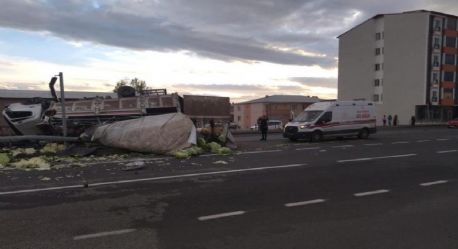 Erzurum’da sebze yüklü kamyon, otomobile çarptıktan sonra devrildi.
