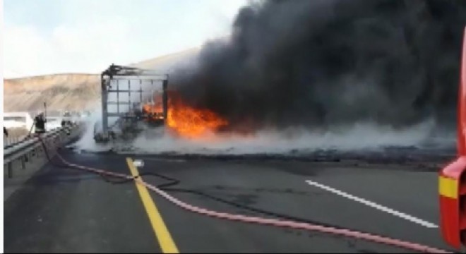 Çat yolunda bir tırın dorsesi alev alev yandı o anlar cep telefonu kameralarına yansıdı. İtfaiye ekiplerinin zorlukla söndürdüğü yangının ardından tır kullanılamaz hale geldi.