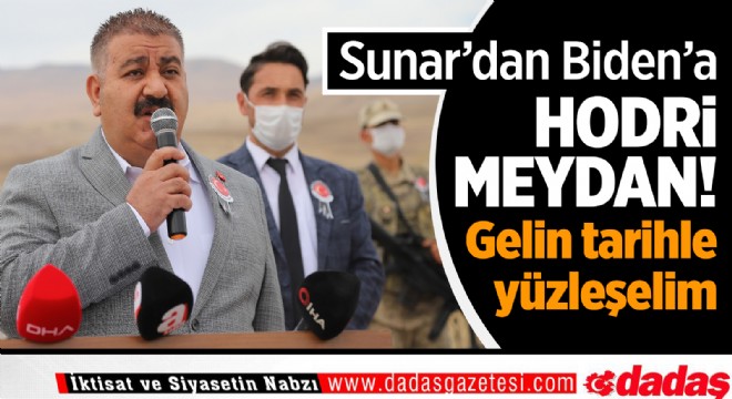Sunar, “Tarihe iftira atanlara sesleniyoruz, ‘hodri meydan!’ diyoruz. Gelin arşivleri açalım, belgelerle konuşalım… Görmeye, duymaya, hakkı ve hakikati konuşmaya var mısınız? Her şey ortada açık ve net.  Bu milletin geçmişinde soykırım ayıbı hiç olmamıştır, Soykırıma uğrayan masum Türk Milletidir. Gelin tarihle yüzleşelim, var mısınız?” Diye sordu.