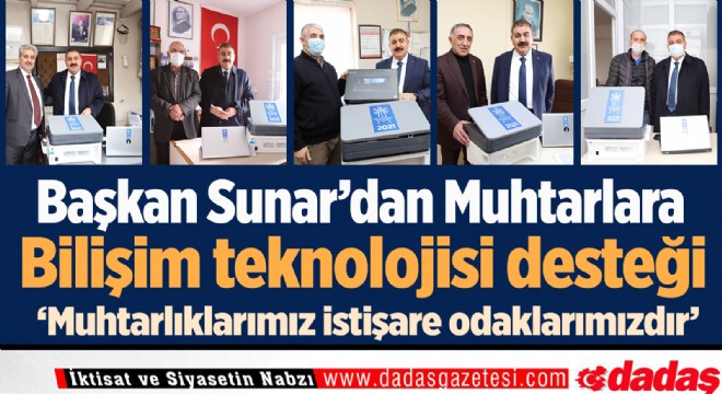 Muhtarlarla, AK Hizmet anlayışına temel oluşturan Danışma ve İstişare kültürü kaydında, periyodik görüşme ve ziyaretlerde bulunduklarını, muhtarlık ofislerinin ihtiyaçlarını gidermek noktasında her türlü desteği sağladıklarını bildiren Başkan Sunar, bu çerçevede yeni bir destek dönemi başlattıklarını açıkladı. Sunar yeni destek dönemi içinde tüm muhtarlara bilgi teknolojisinin temelini oluşturan Bilgisayar yardımı yaptıklarını ifade etti.