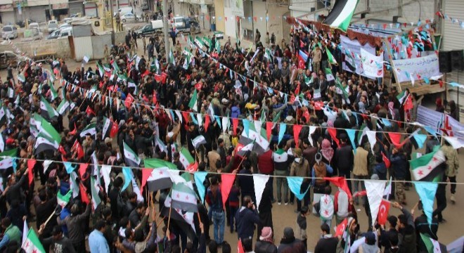 Yüzlerce Suriyeli Türk Silahlı Kuvvetlerinin (TSK) terörden arındırdığı El Bab kentinde Türk askerine ve Türkiye’ye olan desteklerini göstermek için bir araya geldi. Suriye’nin kuzeyindeki terör örgütü PKK’nın yapılanmalarından dolayı evlerinden olduklarını belirten vatandaşlar, üzerinde Türkçe ve Arapça, "Fırat'ın doğusundaki operasyonu sabırsızlıkla bekleyip gasp edilen evlerimize dönmek istiyoruz", "Türklerin bölgemizdeki varlıklarından ancak Beşşar’ın çeteleri ve yeni akım şebbihalar rahatsız olur" yazılı pankartlar taşıdı.