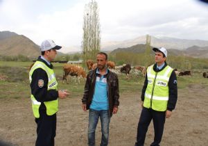 Bölge trafik personeli özellikle çiftçilerin yoğun olduğu kahvehanelerde eğitim ve bilinçlendirme konusuna ağırlık vererek yollara çıkan hayvan sürüleri konusunda çobanları uyarıyor.