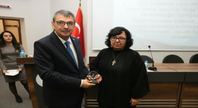 Konferansın sonunda konuklardan gelen sorular yanıtlandı. Rektör Prof. Dr. Ahmet Kutluhan, konferansa katkılarından dolayı Prof. Dr. Nergis Biray’a şilt takdim etti.