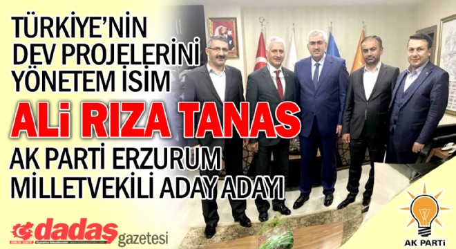 Çevre ve Şehircilik Bakanlığı TED Genel Müdür Yardımcısı Ali Rıza Tanas, bu görevinden istifa ederek AK Parti’den Erzurum Milletvekili aday adayı oldu. Başarılı bürokrat, aday adaylığı başvurusunu yaparak çalışmalarına başladı. AK Parti Erzurum İl Başkanı Mehmet Emin Öz’le bir araya gelen Ali Rıza Tanas, Erzurum’un yüksek bir değeri ifade ettiğini belirterek, “Erzurumlu olmak ise, bana göre bambaşka bir ayrıcalıktır” dedi.