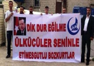 Ülkücülerden Başbakan Erdoğan'a destek.Başbakan Recep Tayyip Erdoğan'ın Ankara'ya dönüşü sırasında Esenboğa Havaalanı'nda 'Etimesgutlu Bozkurtlar' pankartı açan grup, ülkücüler arasında tartışmalara neden oldu.Başbakan Erdoğan'ın Ankara'ya gelişi sırasında, üzerinde Ülkü Ocakları'nın amblemi olan "Dik dur eğilme, Ülkücüler seninle, Etimesgutlu Bozkurtlar' yazılı bir pankart dikkat çekti. Fotoğrafın sosyal medyada paylaşılmasının ardından tartışmalar yaşandı. Özellikle sosyal medya üzerinde yoğunlaşan tartışmalarda destek verenlerin yanı sıra 'çakma bozkurtlar' şeklinde tepki gösterenler de oldu. MHP Genel Merkezi'nden ise konu ile ilgili henüz bir açıklama yapılmadı.İHA