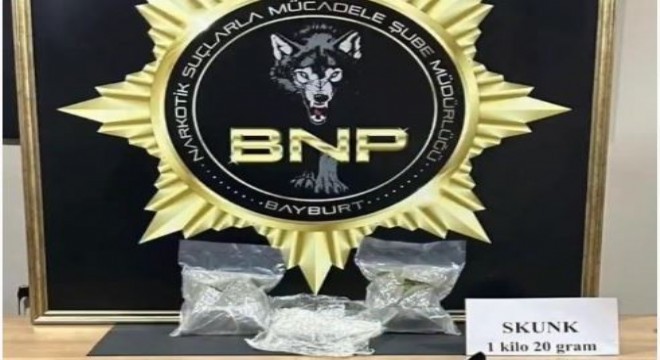 Bayburt İl Emniyet Müdürlüğü Narkotik Suçlarla Mücadele Şube Müdürlüğü ekiplerince Bayburt-Erzurum karayolunda durdurulan otobüste yapılan aramada 1 kilo 20 gram skunk ele geçirildi. Olayla ilgili bir kişi tutuklandı.