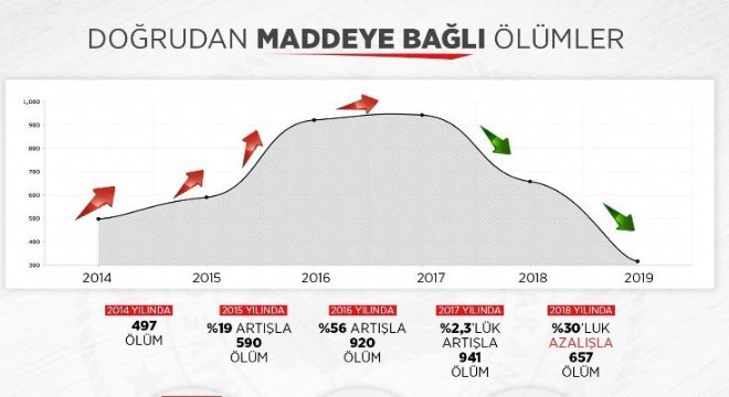 İçişleri Bakanlığı, uyuşturucu maddelere bağlı ölümlerdeki oranların yer aldığı grafiği paylaştı. Son 6 yıla ait ölüm rakamı ve oranlarının yer aldığı grafiğe göre 2014 yılında 497 olan ölüm sayısı, 2015'te yüzde 19 artışla 590'a, 2016'da yüzde 56 artışla 920'ye, 2017'de ise yüzde 2,3'lük artışla 941'e yükseldi. 2018 yılında yüzde 30'luk artışla 657 ölüm görülürken, 2019'da yüzde 45,8'lik düşüşle 315'e geriledi. Adli Tıp Kurumu'nun çalışmasını tamamladığında grafiğin 375 civarında ölüm sayısıyla tamamlanması öngörülüyor. Ayrıca 2018'e göre doğrudan maddeye bağlı ölümlerde yüzde 45 civarı bir düşüş olması öngörülüyor.