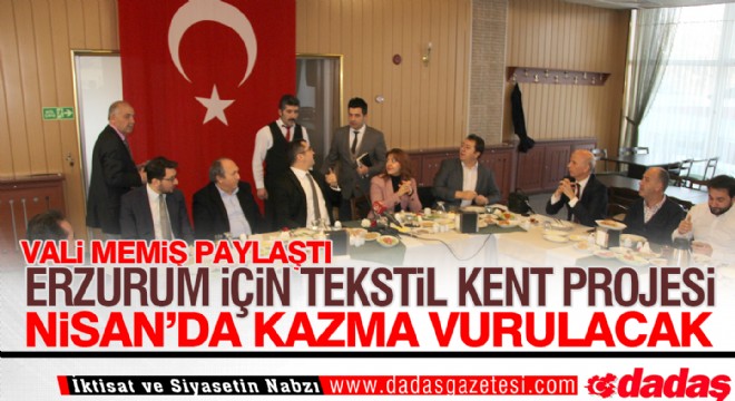 Erzurum Valisi Okay Memiş Erzurum’da 4 bin kişiye istihdam kapısı olacak projeyi düzenlediği basın toplantısında açıkladı. Vali Memiş “4 bin kişinin istihdam edileceği Tekstil kent projesini Erzurum Valiliği olarak biz yapacağız.” Dedi