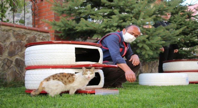 Yeni tip Korona virüs (Covid-19) tedbirleri nedeniyle beslenme imkanı azalan sokak hayvanları için Olur Kaymakamlığı Vefa Sosyal Destek Grubu tarafından atıl olan araç lastikleri mama kaplarına dönüştürdüler.