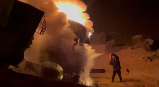 Kars'ın Sarıkamış ilçesinde hafif ticari araçla çarpışan tır, yoldan çıkarak yan yattı. Bir anda alev topuna dönen tırdan çıkan sürücü ise yanmaktan son anda kurtuldu.