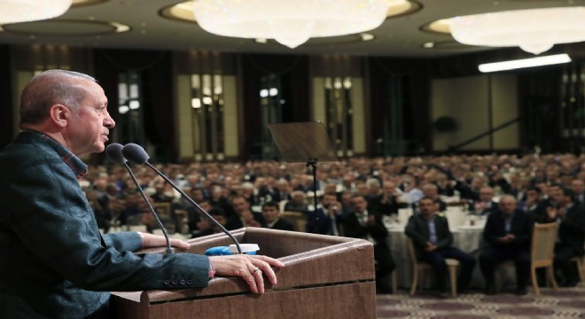 Afyonkarahisar, Amasya, Ankara, Balıkesir, Bilecik, Bolu, Bursa, Çankırı, Çorum, Düzce, Eskişehir, İstanbul, Kastamonu, Kayseri, Kırıkkale, Konya, Kütahya, Manisa, Samsun, Sivas, Tokat, Yozgat ve Zonguldak’tan gelen muhtarları ağırlayan Erdoğan, “Daha önceki muhtarlar toplantılarımızı ana binamızın altındaki 400 kişilik toplantı salonumuzda yapıyordum, yemeğimizi de girişteki kış bahçemizde yiyorduk. Bu şekilde tam 45 toplantı yaptık. Geçtiğimiz yıl ki toplantılarımızdan birini de kültür ve kongre merkezimizde gerçekleştirdik. Ülkemizde 50 bini aşkın muhtar olduğunu düşündüğümüzde 3,5 yıla yakın bir süredir, oldukça sık aralıklarla toplantılarımızı gerçekleştirmemize rağmen henüz yarıya ancak ulaşabildik. Neredeyse her toplantımızda idealimizin 2 bin muhtarımızla aynı anda bir araya gelip, ardından da yemeğimizi yiyebileceğimiz işte bu mekanda sizleri ağırlamak olduğunu ifade etmiştim. Nasip bugüneymiş. Bu gün yaklaşık 2 bin 500 muhtarımızla bir aradayız. Tıpkı camimiz, kongre ve kültür merkezimiz, yan tarafta inşaatı tamamlanacak olan Cumhurbaşkanlığı Kütüphanesi gibi sergi salonumuzun da Ankara’nın ve ülkemizin önemli bir ihtiyacını karşılayacağına inanıyorum. İnşallah Cumhurbaşkanlığı Kütüphanesi de bittiği zaman orada 5 milyon cilt kitap olacak, 24 saat halkımıza açık olacak. Gençlerimiz 24 saat orada gelip dersini çalışacak, kitap okuyacak, kekini, çayını, kahvesini ücretsiz almak suretiyle Cumhurbaşkanlığı makamıyla gençliğinin tadına ulaşmış olacak” şekilde konuştu.