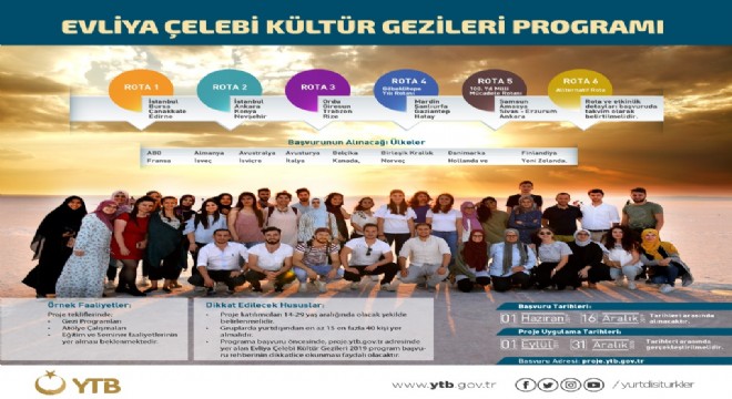Yurt dışındaki gençlerin milli, manevi ve kültürel değerlerimiz ile tarihi köklerimizi yerinde tanımalarını sağlayan “Evliya Çelebi Kültür Gezileri” projeleri, YTB tarafından her yıl desteklenen programlar arasında yer alıyor. Yurt dışında yaşayan gençlerimiz program sayesinde sadece memleketlerini değil, Türkiye’nin tarihi ve kültürel yönden zengin şehirlerini de ziyaret ederek anavatanları ile aidiyet kuruyor. Yurt dışında gençlik alanında faaliyet yürüten; Türk sivil toplum kuruluşlarına ve kar amacı gütmeyen eğitim kurumlarına açık olan destek programına başvurular bu yıl 16 Aralık 2019 tarihinde son buluyor. Kabul edilen projelerin ise 1 Eylül 2019 - 31 Aralık 2020 tarihleri arasında uygulanması bekleniyor.